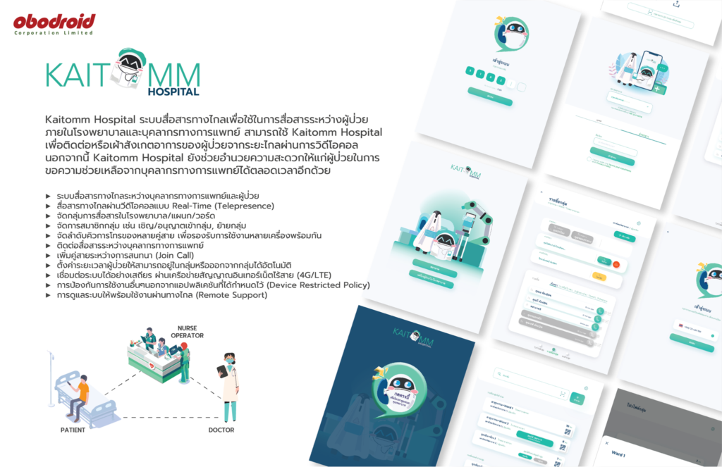 – ระบบการการสื่อสารทางไกลผ่านวีดีโอคอลระหว่างบุคลากรทางการแพทย์และผู้ป่วยในช่วงสถานการณ์โควิด-19 โดยระบบสามารถให้แพทย์/พยาบาลโทรวิดิโอคอลผ่านทางเครื่องแทบเลตของแพทย์/พยาบาล ณ เคาน์เตอร์พยาบาลไปยังเครื่องแทบเลตที่อยู่ในห้องพักของผู้ป่วยได้ โดยการโทรหาผู้ป่วยมีความสะดวกเป็นพิเศษคือสามารถทำได้ในลักษณะที่คล้ายกับระบบ CCTV โดยที่ไม่ต้องรอให้ผู้ป่วยรับสาย ในขณะเดียวกันผู้ป่วยเองก็สามารถโทรติดต่อกลับมาหาพยาบาลได้อย่างสะดวก นอกจากนี้ระบบยังมีฟังก์ชั่นการจัดกลุ่มแพทย์/พยาบาล/คนไข้ มีความสะดวกในการจัดกลุ่ม และระบบสามารถ forward call ให้แพทย์, เภสัชกรหรือผู้เกี่ยวข้องอื่นๆ และให้บุคลากรทางการแพทย์ติดต่อสื่อสารกันเองได้ โดยระบบนี้ผู้ป่วยสามารถดาวน์โหลดแอปพลิเคชันลงบนมือถือส่วนตัวของตนเอง (ชื่อ Kaitomm Care) หรือบนมือถือของบุคลากรทางการแพทย์ (ชื่อ Kaitomm Doctor) เพื่อเชื่อมต่อการสื่อสารระหว่างกันได้สะดวกรวดเร็วยิ่งขึ้นต่อไปอีกด้วย
