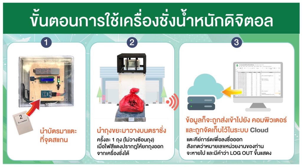 – เครื่องชั่งน้ำหนักมูลฝอยติดเชื้อระบบดิจิตอล สามารถส่งน้ำหนักมูลฝอยติดเชื้อแยกตามหน่วยงาน และนำข้อมูลเข้าสู่คอมพิวเตอร์ได้ โดยไม่ต้องจดลงกระดาษ เป็นการลดขั้นตอนในการทำงาน และลดการแพร่กระจายเชื้อโรค ซึ่งสอดคล้องกับการบริหารจัดการมูลฝอยติดเชื้อของโรงพยาบาลฯ ที่ส่งเสริมการจัดเก็บรวบรวมและส่งกำจัดให้ถูกต้อง และไม่ปะปนมูลฝอยติดเชื้อรวมกับมูลฝอยประเภทอื่น ลดความเสี่ยงในการแพร่กระจายเชื้อโรคซึ่งมีผลต่อสุขภาพอนามัยของประชาชน และสุขภาพอนามัยของเจ้าหน้าที่ผู้ปฏิบัติงาน