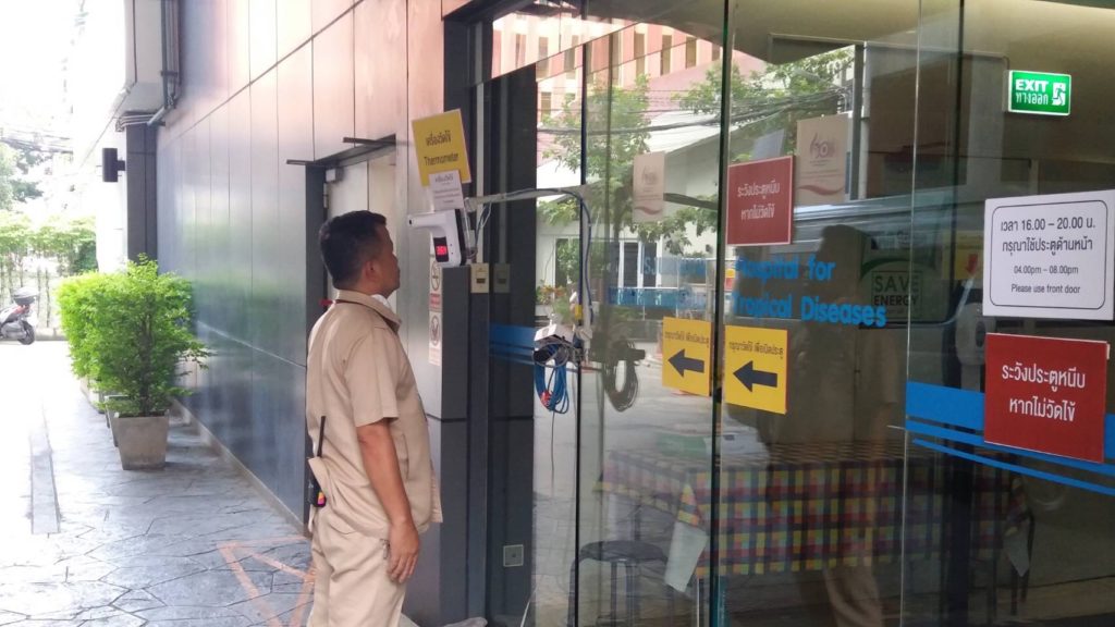 – เครื่องวัดอุณหภูมิร่างกายหรือตรวจวัดไข้แบบอัตโนมัติ เพื่อช่วยในการคัดกรองผู้รับบริการก่อนเข้ามาภายในอาคารโรงพยาบาลฯ โดยใช้หลักการนำเครื่องวัดอุณหภูมิอัตโนมัติแบบอินฟาเรดที่ได้มาตรฐานที่มีขายทั่วไปในท้องตลาดมาเชื่อมต่อเพิ่มเติมกับชุดประมวลผลอุณหภูมิและส่งสัญญาณต่อไปยังชุดวงจรควบคุมประตูอัตโนมัติของอาคาร ซึ่งหากอุณหภูมิที่ตรวจวัดได้เกินกว่าค่าที่กำหนดไว้คือ 37.5 °C จะมีผลสั่งไม่ให้ประตูเปิดให้บุคลากรหรือคนไข้เข้ามาภายในอาคาร ซึ่งบุคลากรหรือคนไข้ดังกล่าวจะต้องเดินไปยังประตูทางเข้าด้านหน้าของอาคาร เพื่อตรวจประเมินคัดกรองโดยเจ้าหน้าที่คัดกรองอีกครั้งต่อไป จึงจะสามารถผ่านเข้ามาในอาคารได้