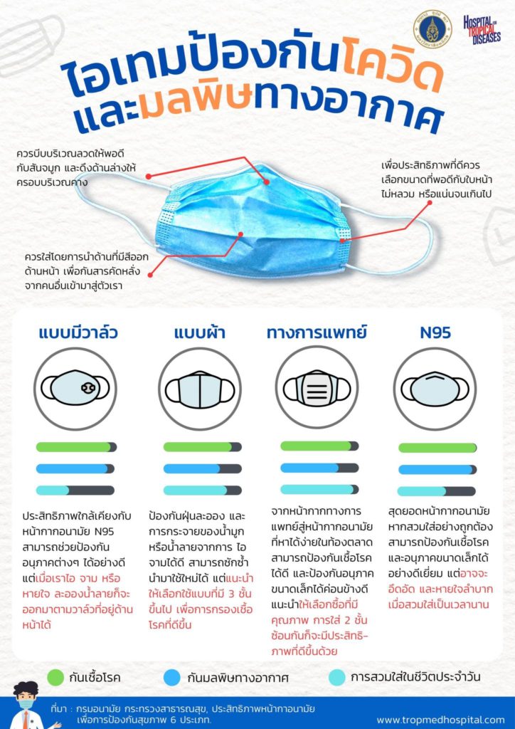 ทั้งนี้ประสิทธิภาพของการป้องกันเชื้อโรค และมลพิษทางอากาศต่างๆ ไม่ได้อยู่ที่ตัวหน้ากากอนามัยเพียงอย่างเดียว แต่การสวมใส่ที่ถูกต้อง การหมั่นล้างมือ ทำความสะอาดพื้นผิวที่สัมผัสให้สะอาด ไม่อยู่ในที่แออัด ก็มีผลเช่นกัน เราอยากเห็นทุกท่านสุขภาพดี ด้วยความปรารถนาดีจากโรงพยาบาลเวชศาสตร์เขตร้อน