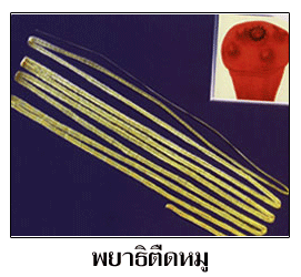 มีลักษณะกลมสีน้ำตาลเหลือง เมื่อหมูหรือวัวกินไข่ของพยาธิตัวตืดเข้าไป ไข่จะฟักเป็นพยาธิตัวอ่อนในลำไส้แล้วไชเข้ากระแสเลือดไปอยู่ในกล้าม เนื้อทั่วร่างกาย และอวัยวะอื่นๆ ของหมูหรือวัว ลักษณะเป็นถุงน้ำใสเล็กๆ ขาวๆ คล้ายเม็ดสาคู มีหัวของพยาธิอยู่ภายใน ซึ่งเป็นระยะติดต่อ เมื่อคนกินหมูหรือวัวที่มี เม็ดสาคูโดยไม่ปรุงสุก หรือสุกๆดิบๆ พยาธิตัวอ่อนจะโผล่หัวออกมา และเจริญเติบโตเป็นพยาธิ เต็มวัยเกาะติดอยู่กับผนังลำไส้เล็กโดยมีปล้องยาวออกไปเรื่อยๆ พยาธิตัวเต็มวัยทำ ให้เกิดอาการท้องอืด อาหารไม่ย่อย เบื่ออาหาร รวมทั้งคลื่นไส้ อาเจียน และซีด จากภาวะโลหิตจาง