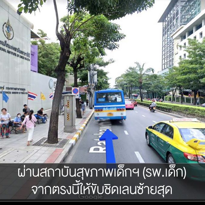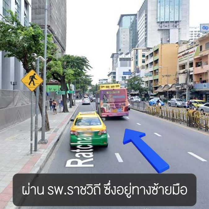 3) เดินมาตามถนนราชวิถี ตามเส้นลูกศรสีแดงราว 750 เมตร จะผ่านโรงพยาบาลราชวิถี โรงพยาบาลเด็ก