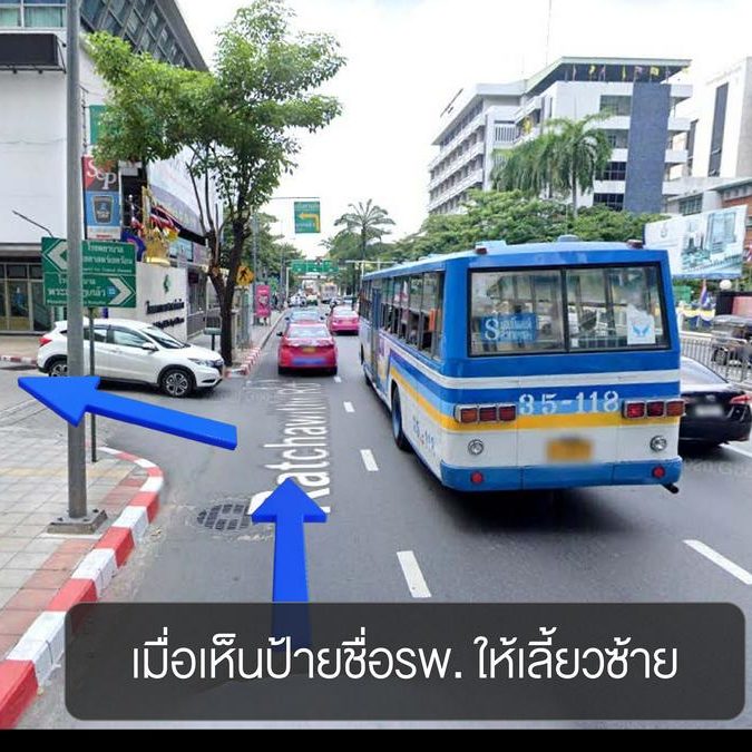 สามารถลงรถที่ป้ายฝั่ง รพ.พระมงกุฎ หรือฝั่ง รพ.เด็กก็ได้ โดยเบื้องต้นสามารถ ใช้บริการรถประจำทางหมายเลข 108, 12, 8, 14, 157, 166, 171, 28, 509, 515, 536, 539 ปอ.พ. 25 ปอ.พ. 4 หรือหากท่านไม่แน่ใจสามรถนั่งสายอื่นและลงยังป้ายอนุเสาวรีย์ชัยสมรภูมิและเดินตามลูกศรสีแดงตามข้อ 1