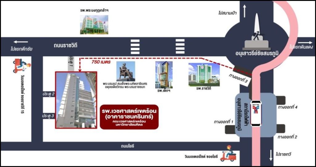 4) หลังจากนั้นจะผ่านพระบรมรูปสมเด็จพระมหิตลาธิเบศรฯ คณะสาธารณสุขศาสตร์ และจะพบทางเข้าโรงพยาบาลเวชศาสตร์เขตร้อนอยู่ด้านซ้ายมือ