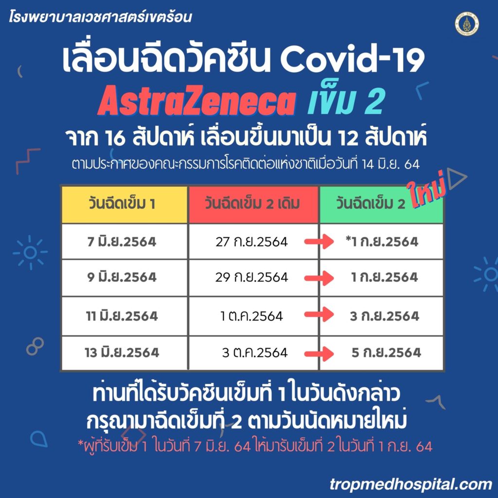 ประกาศเลื่อนฉีดวัคซีน COVID-19 เข็มที่ 2 ในรอบวันที่ 7-13 มิถุนายน 2564 เร็วขึ้น จาก 16 สัปดาห์ เป็น 12 สัปดาห์