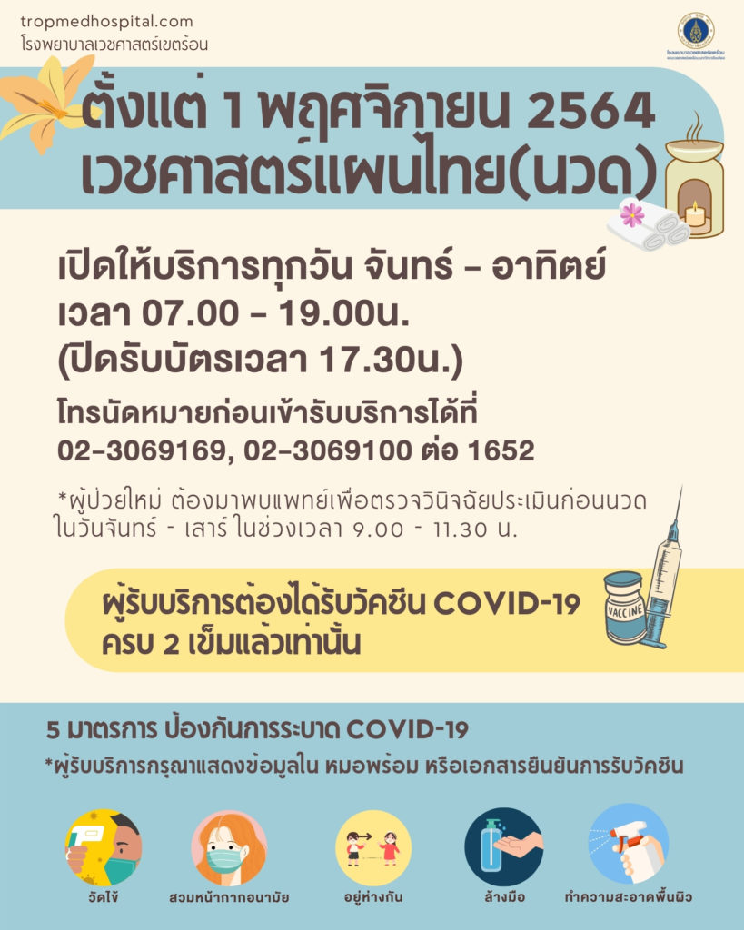 ตั้งแต่วันที่ 1 พฤศจิกายน 2564 เวชศาสตร์แผนไทย(นวด) จะเปิดให้บริการในวัน ให้บริการในวันจันทร์ – เสาร์ เวลา 07.00 – 19.00 น. (ปิดรับบัตรเวลา 17.30 น.)*ผู้รับบริการจะต้องฉีดวัคซีน COVID-19 ครบ 2 เข็มเท่านั้น*