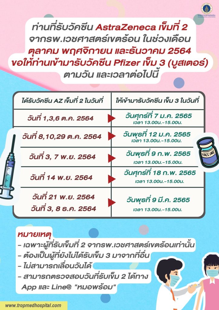 ท่านที่รับวัคซีน AstraZeneca เข็มที่ 2 จากรพ.เวชศาสตร์เขตร้อน ในช่วงเดือนตุลาคม พฤศจิกายนและ ธันวาคม 2564 ขอให้ท่านเข้ามารับวัคซีน Pfizer เข็ม 3 (บูสเตอร์) ตามวัน และเวลาในภาพได้เลยนะครับ