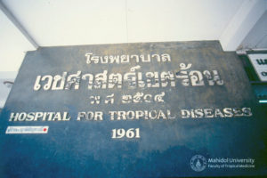 **********โรงพยาบาลเวชศาสตร์เขตร้อนก่อตั้งเมื่อวันที่ 23 กุมภาพันธ์ พ.ศ. 2504 โดย ศาสตราจารย์ นายแพทย์ จำลอง หะริณสุต และศาสตราจารย์ แพทย์หญิง คุณหญิงตระหนักจิต หะริณสุต เป็นหน่วยงานในคณะเวชศาสตร์เขตร้อน มหาวิทยาลัยมหิดล ณ ตึกเวชกรรมเมืองร้อน อาคาร 3 ชั้น มีศาสตราจารย์ แพทย์หญิง คุณหญิงตระหนักจิต หะริณสุต เป็นผู้อำนวยการโรงพยาบาลคนแรก โรงพยาบาลเปิดรับรักษาเฉพาะผู้ป่วยใน ซึ่งเป็นผู้ป่วยที่ถูกส่งมาจากโรงพยาบาลศิริราช หรือสถานพยาบาลอื่น ๆ ในสมัยนั้นมีหอผู้ป่วยเพียงหอเดียว เป็นหอผู้ป่วยรวม ใช้ฉากกั้นระหว่างผู้ป่วยชายและผู้ป่วยหญิง มีจำนวน 20 เตียง