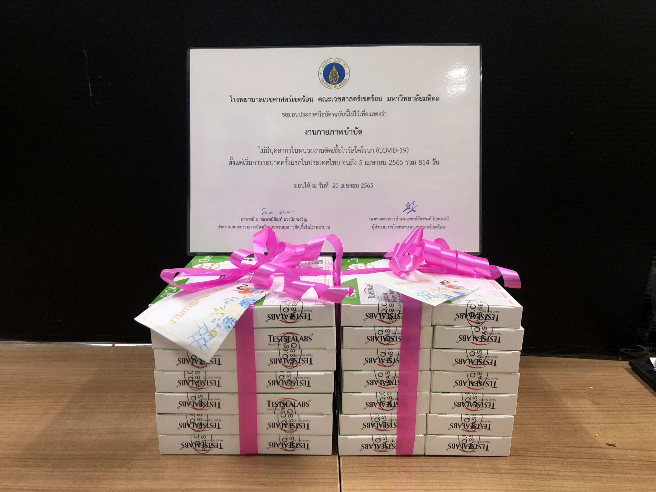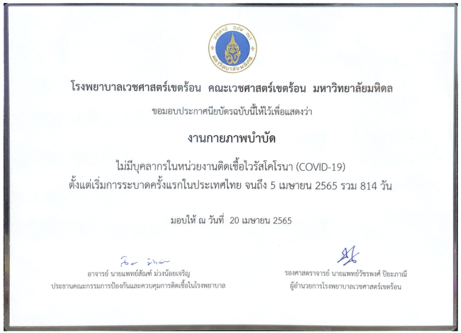 วันที่ 20 เมษายน 2565 รองศาสตราจารย์ นายแพทย์วัชรพงศ์ ปิยะภาณี ผู้อำนวยการโรงพยาบาลเวชศาสตร์เขตร้อน มหาวิทยาลัยมหิดล ได้มอบประกาศนียบัตรแก่งานกายภาพบำบัด เนื่องจากไม่มีบุคลากรในหน่วยงานติดเชื้อไวรัสโคโรนา (COVID-19) ตั้งแต่เริ่มการระบาดครั้งแรกในประเทศไทย จนถึง 5 เมษายน 2565 รวม 814 วัน พร้อมทั้งได้รับชุดตรวจ ATK จำนวน 28 ชุด เพื่อเป็นขวัญและกำลังใจในการปฏิบัติงานแก่นักกายภาพบำบัด ได้ให้การรักษาทางกายภาพบำบัดอย่างปลอดภัยทั้งบุคลากรและผู้มารับบริการต่อไป