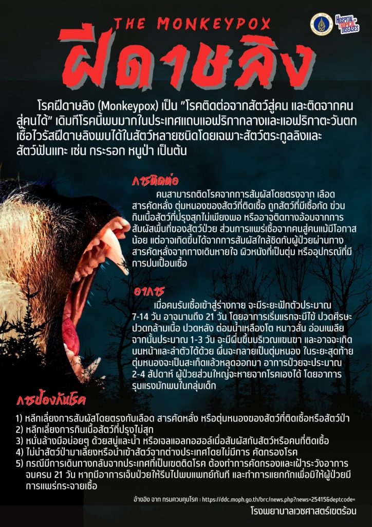 โรคฝีดาษลิง (Monkeypox) เป็น ”โรคติดต่อจากสัตว์สู่คน และติดจากคนสู่คนได้” เดิมทีโรคนี้พบมากในประเทศแถบแอฟริกากลางและแอฟริกาตะวันตก อันที่จริงไม่ใช่โรคอุบัติใหม่ แต่ครั้งนี้ที่ต้องมีการเตือนประชาชนให้ดูแลป้องกันตนเองเนื่องจากพบผู้ป่วยแล้วในหลายประเทศนอกเขตแอฟริกา เช่น สหรัฐอเมริกา อิสราเอล สิงคโปร์ และสหราชอาณาจักร ซึ่งอาจเกิดจากการเดินทางระหว่างประเทศหรือการนำเข้าสัตว์ที่ติดเชื้อ ซึ่งเชื้อไวรัสฝีดาษลิงพบได้ในสัตว์หลายชนิด โดยเฉพาะสัตว์ตระกูลลิงและสัตว์ฟันแทะ เช่น กระรอก หนูป่า เป็นต้น